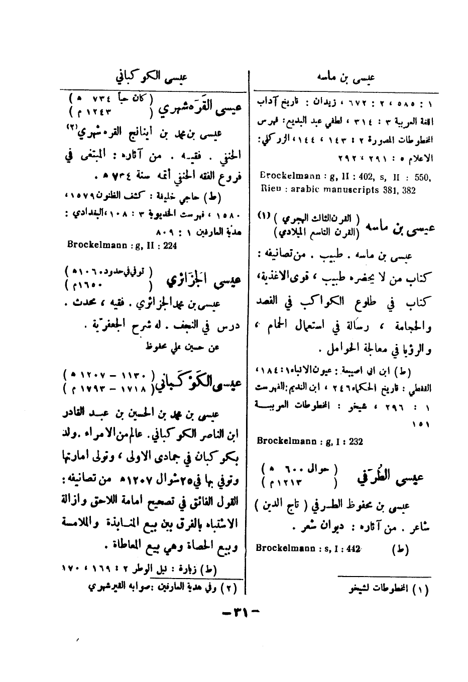 (ط) حاجي خليفة: كشف الظنون 1579، 1580، فهرست الخديوية 3: 108، البغدادي: هدية العارفين 1: 809 224: Brockelmann: g , II عيسى الجزائري (توفي في حدود 1060 هـ) (1650 م) عيسى بن محمد الجزائري.