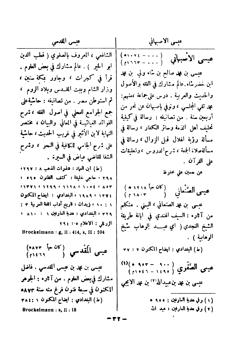 1: 10، زيدان: تاريخ آداب اللغة العربية 3: 329، البغدادي: هدية العارفين 1: 810، الزر كلي: الاعلام 5: 294 594: Brockelmann: g , II: 414 , s , II عيسى المقدسي (كان حيا 873 هـ) (1469 م) عيسى بن محمد بن عيسى المقدسي.