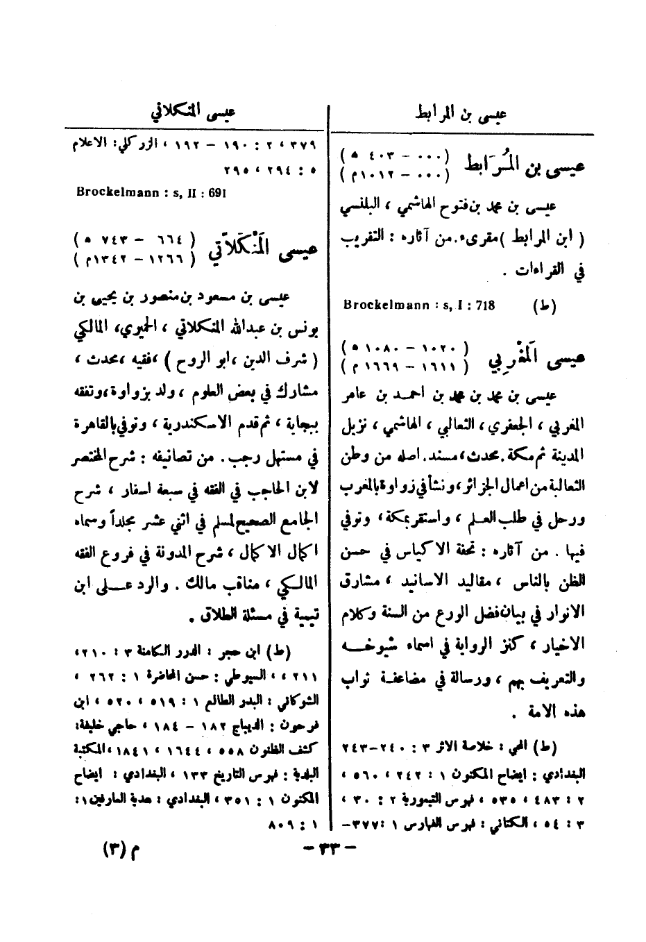 (ط) المحبي: خلاصة الاثر 3: 240 - 243 البغدادي: ايضاح المكنون 1: 242، 560، 2: 483، 535، فهرس التيمورية 2: 30، 3: 54، الكتاني: فهرس الفهارس 1: 377 - 379، 2: 190 - 192، الزر كلي: الاعلام 5: 294، 295 691: Brockelmann: s , II عيسى المنكلاتي (664 - 743 هـ) (1266 - 1342 م) عيسى بن مسعود بن منصور بن يحيى بن يونس بن عبد الله المنكلاتي، الحميري، المالكي (شرف الدين، أبو الروح) ، فقيه، محدث، مشارك في بعض العلوم، ولد بزواوة، وتفقه