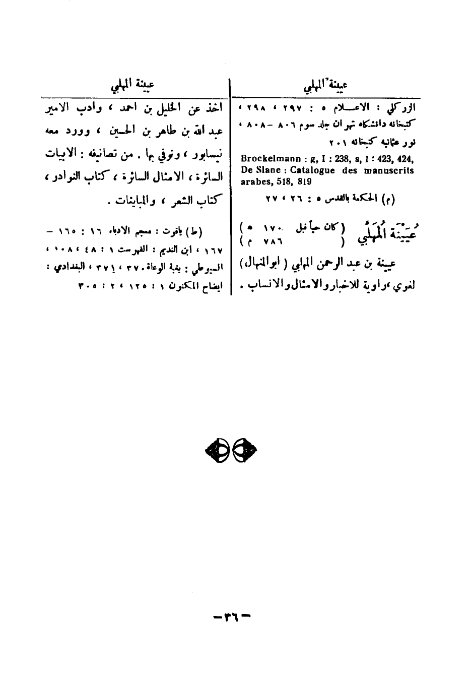 الزر كلي: الاعلام 5: 297، 298، كتبخانه دانشكاه تهران جلد سوم 806 - 808، نور عثمانيه كتبخانه 201 424 , 423: Brockelmann: g , I: 832 , s , I De Slane: Catalogue des manuscrits 819 , 518 arabes (م) الحكمة بالقدس 5 ط 26، 27 عيينة المهلبي (كان حيا قبل 170 هـ) (786 م) عيينة بن عبد الرحمن المهلبي (أبو المنهال) لغوي، راوية للاخبار والامثال والانساب.