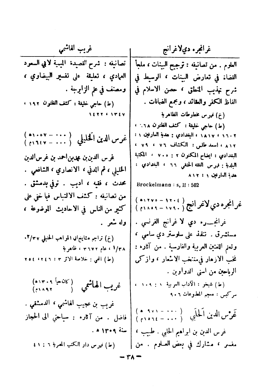 (خ) فهرس مخطوطات الظاهرية (ط) حاجي خليفة: كشف الظنون 68، 1602، 1817، البغدادي: هدية العارفين 1: 812، اسعد طلس: الكشاف 76، 79، البغدادي: ايضاح المكنون 2: 705، المكتبة البلدية: فهرس الفقه الحنفي 66، البغدادي: هدية العارفين 1: 812 502: Brockelmann: s , II غرانجره دي لاغرانج (1204 - 1275 هـ) (1790 - 1859 م) غرانجره دي لا غرانج الفرنسي.