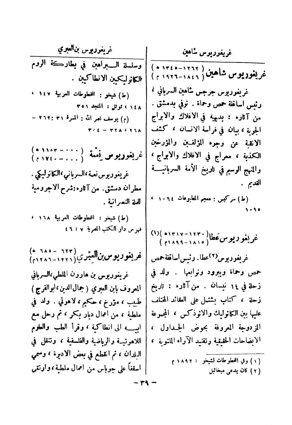 (ط) شيخو: المخطوطات العربية 168، فهرس دار الكتب المصرية 7: 46 غريغوريوس بن العبري (623 - 685 هـ) (1226 - 1286 م) غريغوريوس بن هارون الملطي، السرياني المعروف بابن العبري (جمال الدين، أبو الفرج) طبيب، مؤرخ، حكيم، لاهوتي.