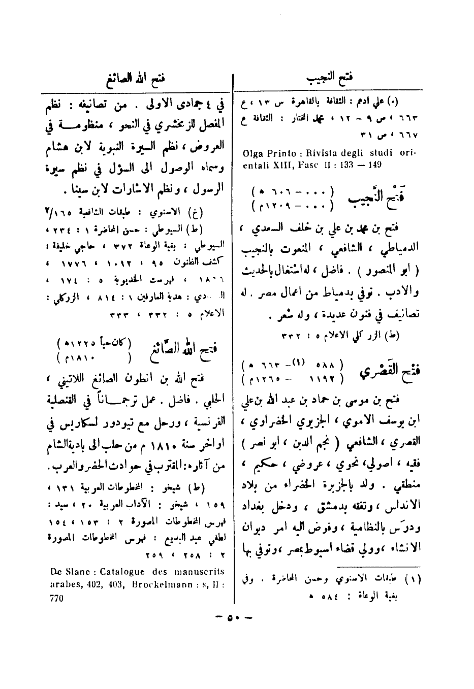 (م) علي ادهم: الثقافة بالقاهرة س 13، ع 663، ص 9 - 12، محمد المختار: الثقافة ع 667، ص 31 - Olga Printo: Rivista degli studi ori 149 - 133: entali XIII , Fasc II فتح النجيب (..- 606 هـ) (..- 1209 م) فتح بن محمد بن علي بن خلف السعدي، الدمياطي، الشافعي، المنعوت بالنجيب (أبو المنصور) .