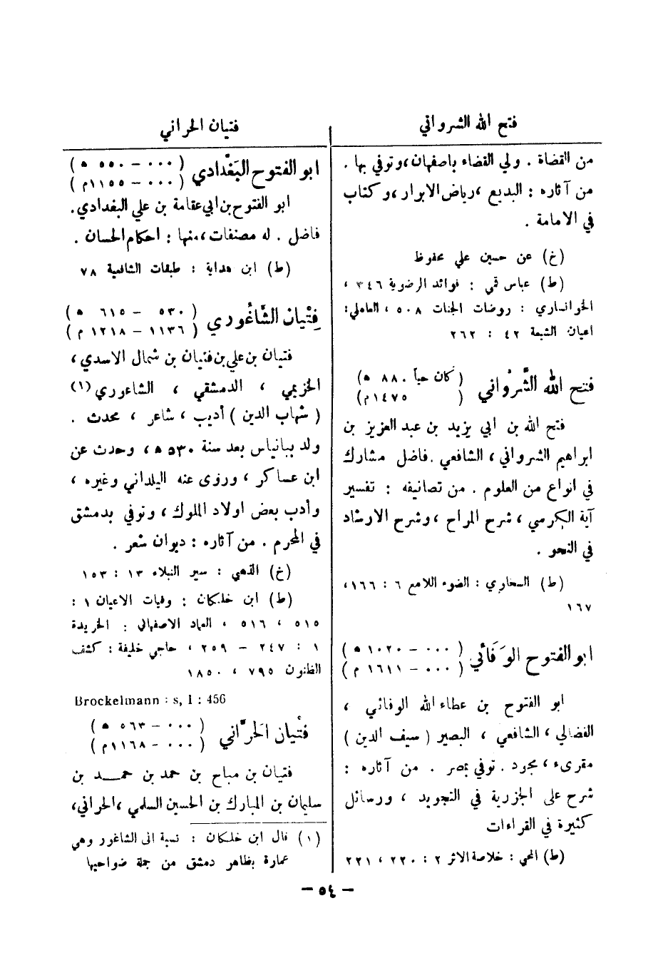 (خ) الذهبي: سير النبلاء 13: 153 (ط) ابن خلكان: وفيات الاعيان 1: 515، 516، العماد الاصفهاني: الخريده 1: 247 - 259، حاجي خليفة: كشف الظنون 795، 1850 456: Brockelmann: s , I فتيان الحراني (..- 563 هـ) (..- 1168 م) فتيان بن مباح بن حمد بن حمد بن سليمان بن المبارك بن الحسين السلمي، الحراني،