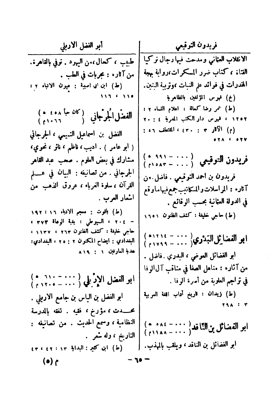 (ط) ياقوت: معجم الادباء 16: 192 204 - السيوطي: بغية الوعاة 373، حاجي خليفة: كشف الظنون 263، 1137، البغدادي: ايضاح المكنون 2: 25، البغدادي: هدية العارفين 1: 819 أبو الفضل الاربلي (..- 610 هـ) (..- 1205 م) أبو الفضل بن الياس بن جامع الاربلي.