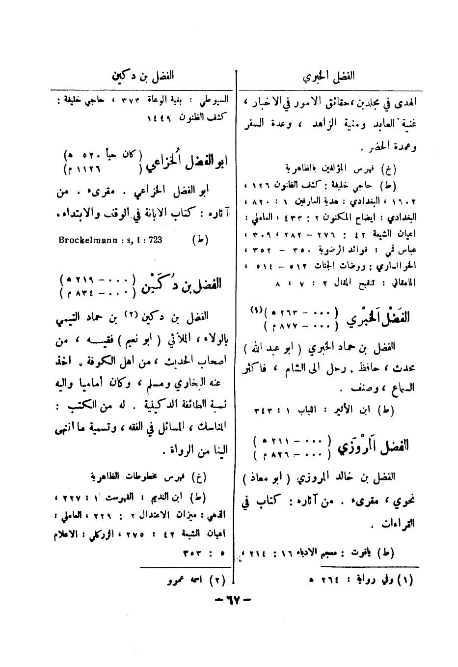 (ط) 723: Brockelmann: s , I الفضل بن دكين (..- 219 هـ) (..- 834 م) الفضل بن دكين (2) بن حماد التيمي بالولاء الملآئي (أبو نعيم) فقيه، من