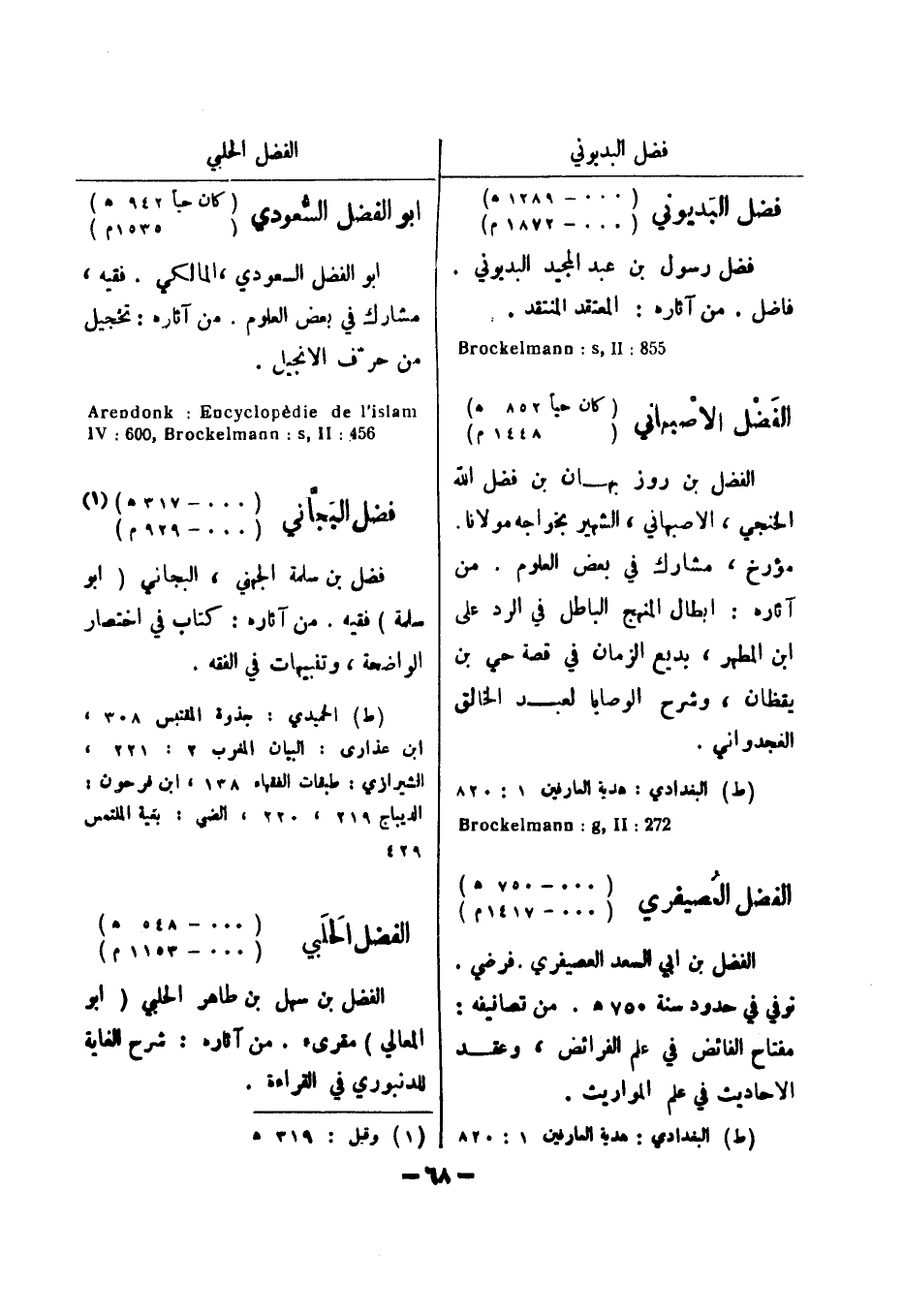 Arendonk: Encyclopedie de l ' islam 456: IV: 006 , Brockelmann: s , II فضل البجاني (..- 317 هـ) (1) (..- 929 م)