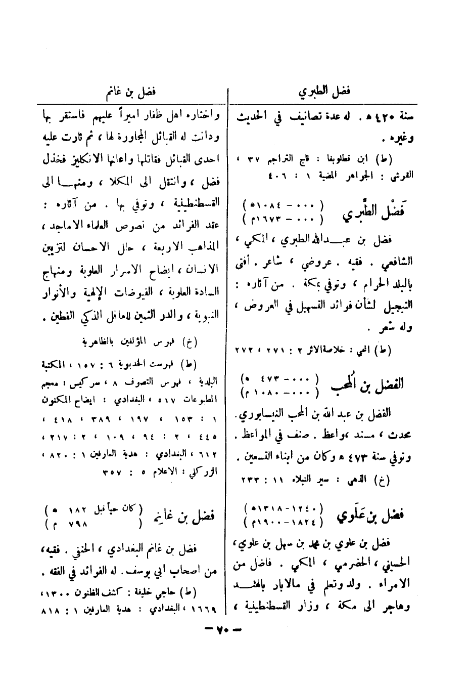 (خ) فهرس المؤلفين بالظاهرية (ط) فهرست الخديوية 6: 157، المكتبة البلدية، فهرس التصوف 8، سركيس: معجم المطبوعات 517، البغدادي: ايضاح المكنون 1: 153، 197، 389، 418، 445، 2: 94، 109، 2: 217، 612، البغدادي: هدية العارفين 1: 820، الزر كلي: الاعلام 5: 357 فضل بن غانم (كان حيا قبل 182 هـ) (798 م) فضل بن غانم البغدادي، الحنفي.