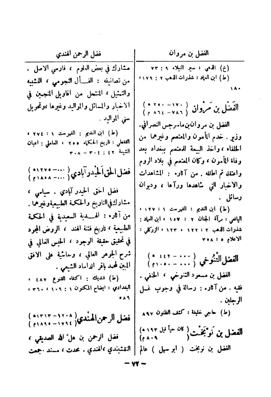 (ط) ابن النديم: الفهرست 1: 274، القفطي: تاريخ الحكماء 255، العاملي: اعيان الشيعة 42: 304 - 308 فضل الحق الحيدر آبادي (..- 1275 هـ) (..- 1858 م)