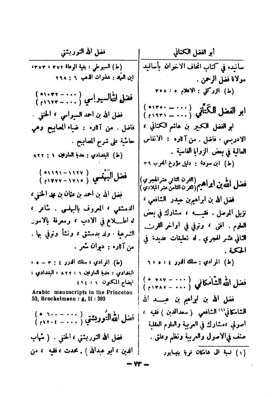 (ط) البغدادي: هدية العارفين 1: 822 فضل البهنسي (1127 - 1191 هـ) (1715 - 1777 م) فضل الله بن احمد بن عثمان بن محمد الحنفي، الدمشقي، المعروف بالبهنسي.
