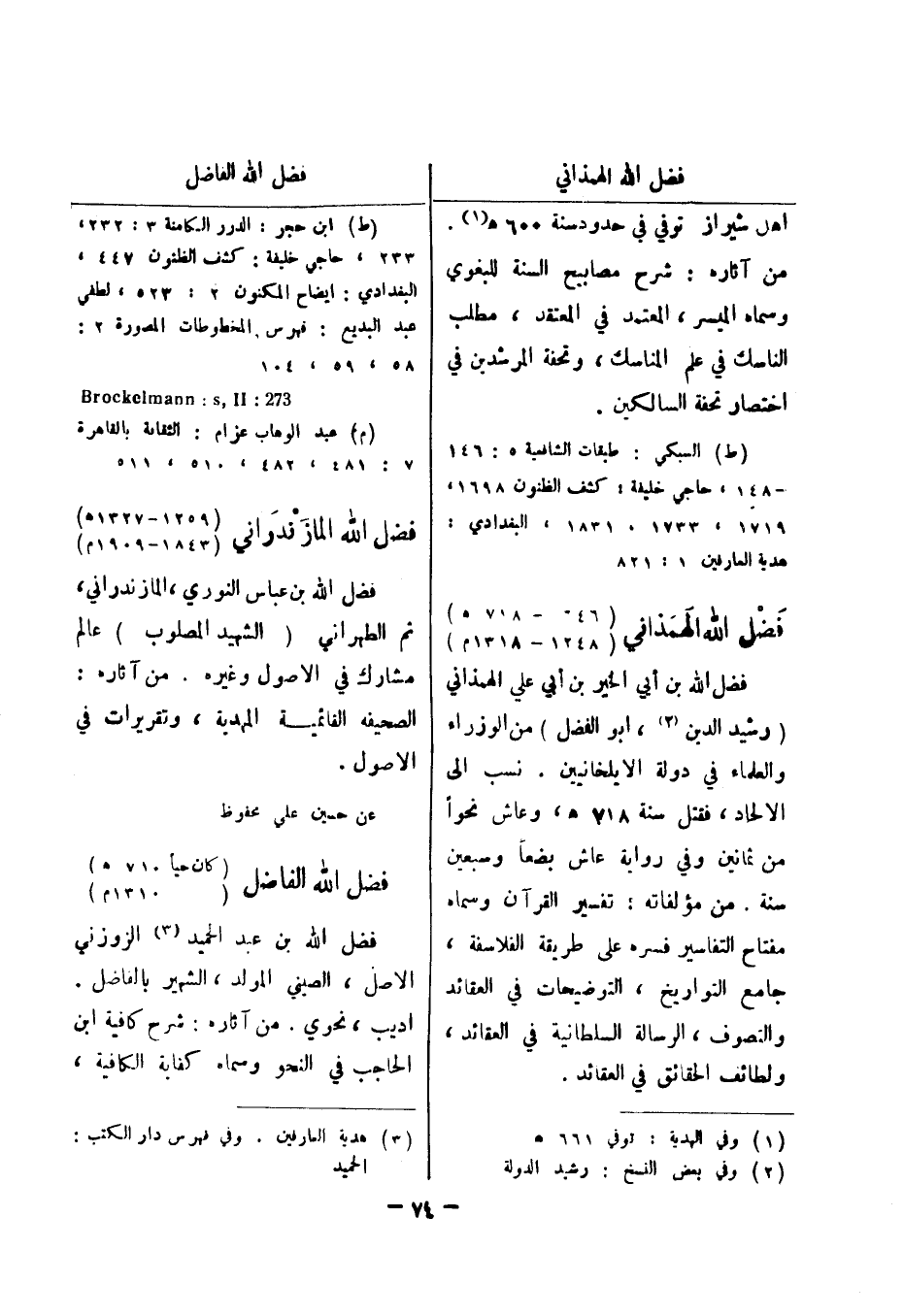 (ط) السبكي: طبقات الشافعية 5: 146 - 148، حاجي خليفة: كشف الظنون 1698، 1719، 1733، 1831، البغدادي: هدية العارفين 1: 821 فضل الله الهمذاني (646 - 718 هـ) (1248 - 1318 م) فضل الله بن أبي الخير بن أبي علي الهمذاني (رشيد الدين (2) ، أبو الفضل) من الوزراء والعلماء في دولة الايلخانيين.