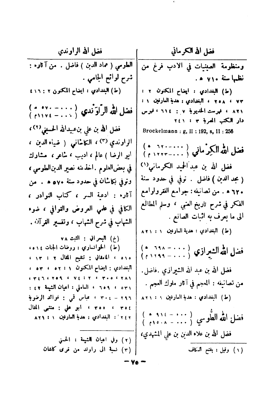 (ط) البغدادي: ايضاح المكنون 2: 416 فضل الله الراوندي (..- 570 هـ) (..- 1174 م) فضل الله بن علي بن عبيد الله الحسيني (2) ، الراوندي (3) ، الكاشاني (ضياء الدين، أبو الرضا) عالم، اديب، شاعر، مشارك في بعض العلوم.