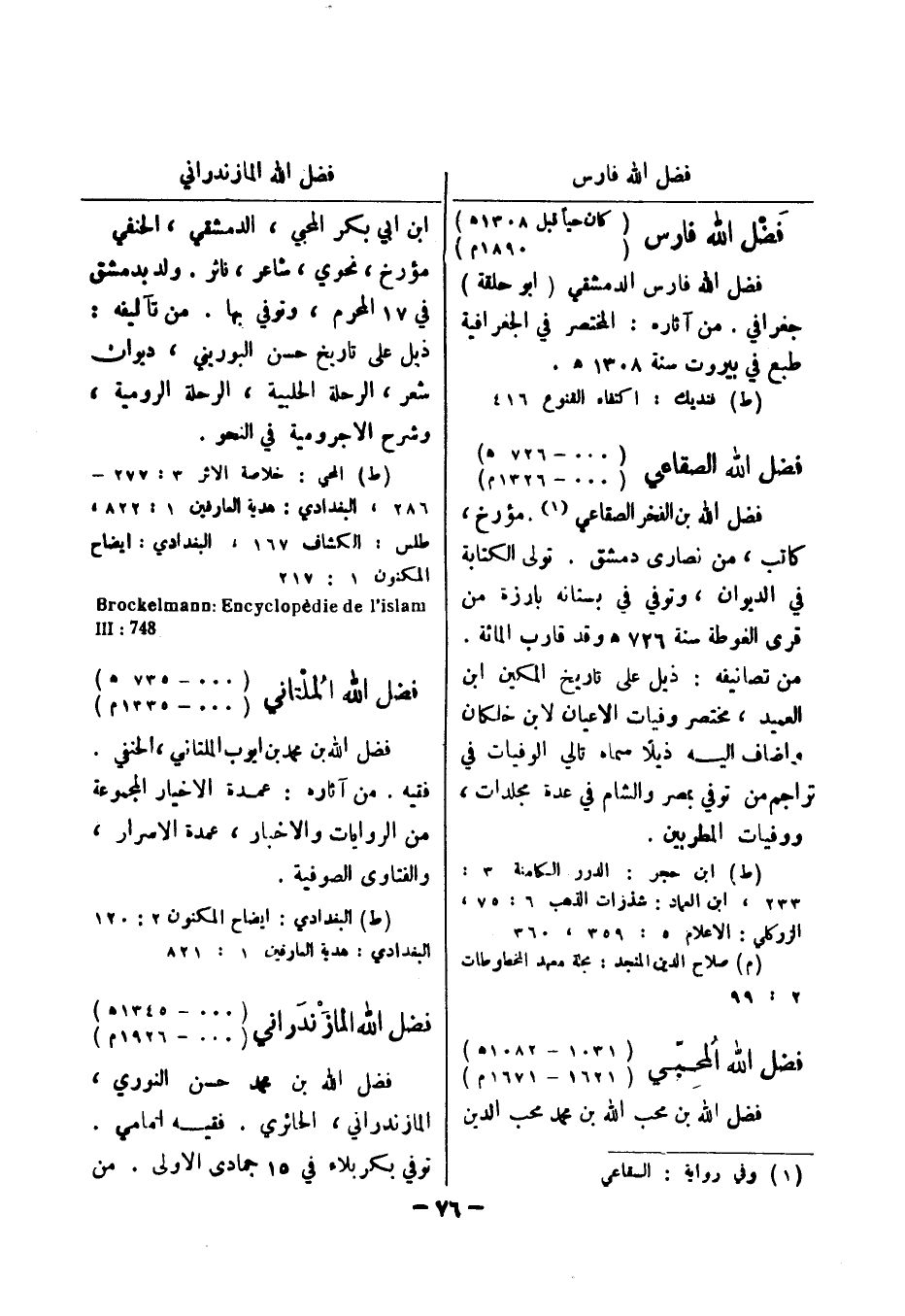 (ط) ابن حجر: الدرر الكامنة 3: 233، ابن العماد: شذرات الذهب 6: 75، الزركلي: الاعلام 5: 359، 360 (م) صلاح الدين المنجد: مجلة معهد المخطوطات 2: 99 فضل الله المحبي (1031 - 1082 هـ) (1621 - 1671 م) فضل الله بن محب الله بن محمد محب الدين