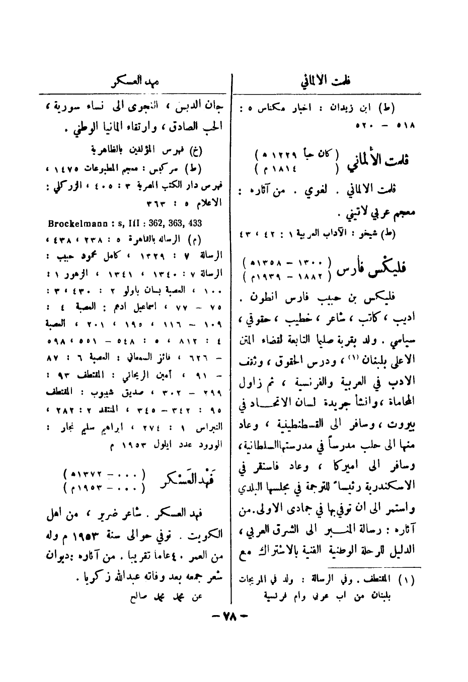 (ط) شيخو: الآداب العربية 1: 42، 43 فليكس فارس (1300 - 1358 هـ) (1882 - 1939 م) فليكس بن حبيب فارس انطون.