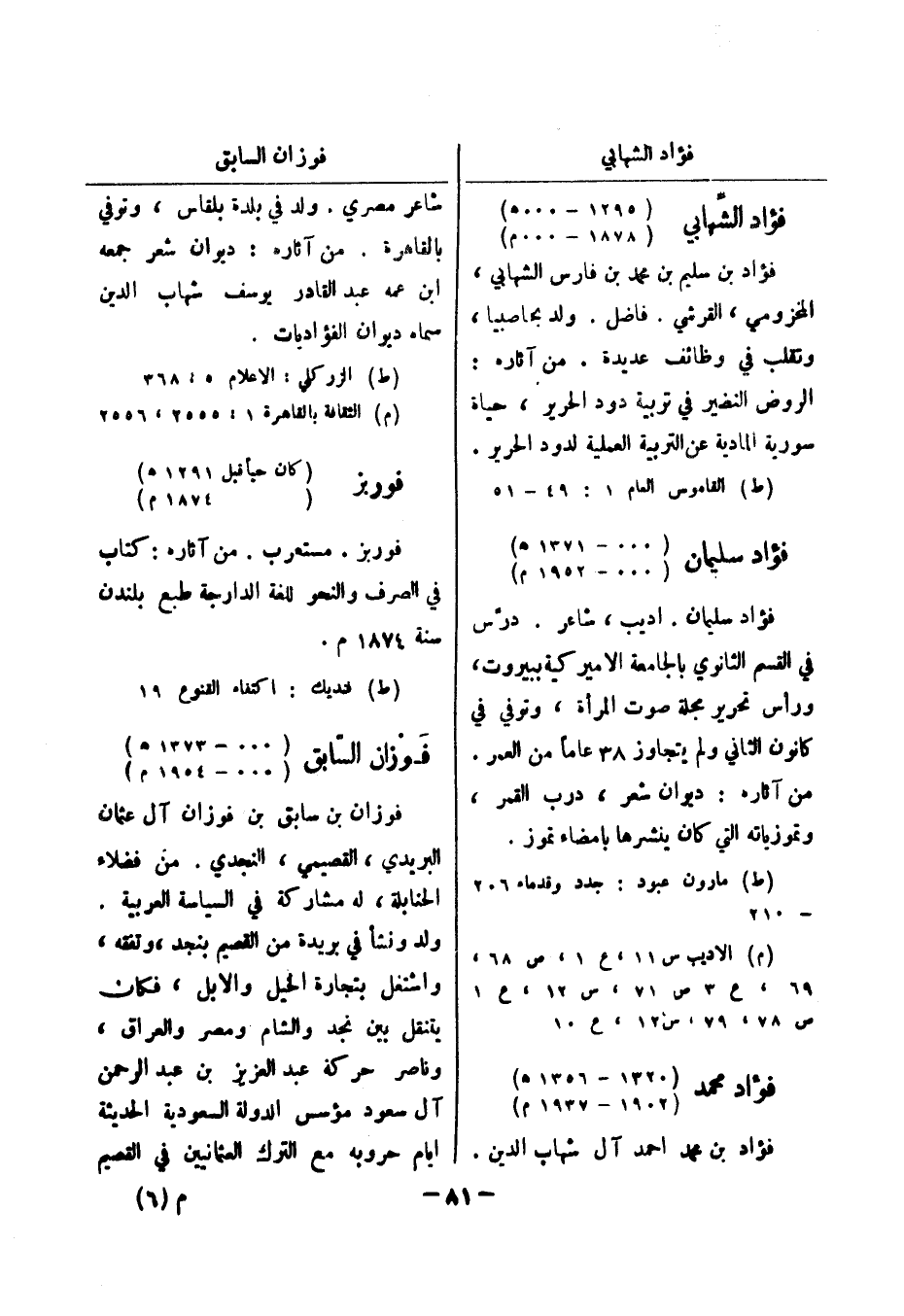 (ط) مارون عبود: جدد وقدماء 206 - 210 (م) الاديب س 11، ع 1، ص 68، 69، ع 3 ص 71، س 12، ع 1 ص 78، 79، س 12، ع 10 فؤاد محمد (1320 - 1356 هـ) (1902 - 1937 م) فؤاد بن محمد احمد آل شهاب الدين.