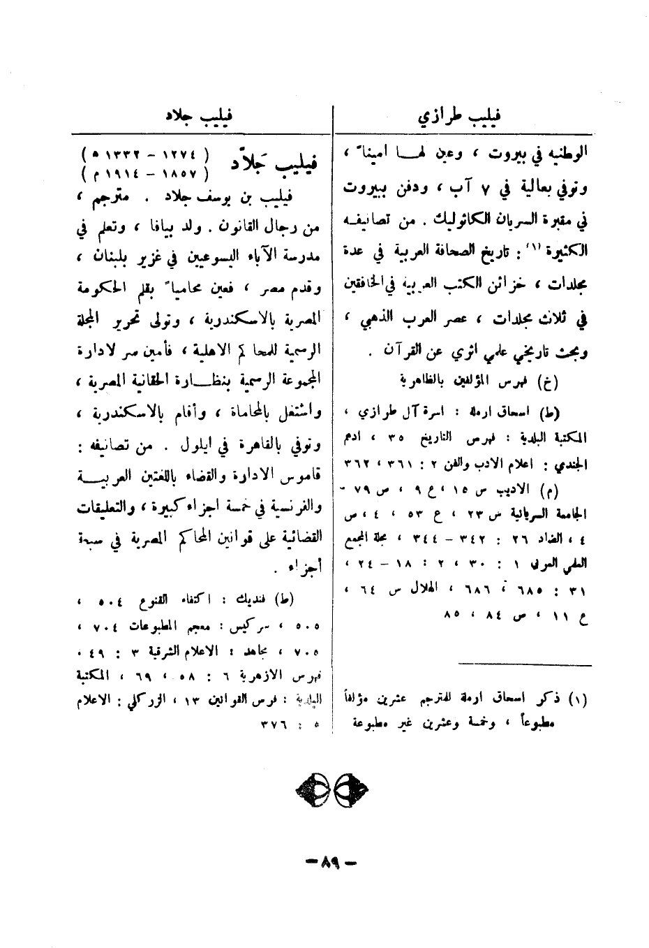 (خ) فهرس المؤلفين بالظاهرية (ط) اسحاق ارملة: اسرة آل طرازي، المكتبة البلدية: فهرس التاريخ 35، ادهم الجندي: اعلام الادب والفن 2: 361، 362 (م) الاديب س 15، ع 9، ص 79 - الجامعة السريانية س 23، ع 53، 4، ص 4، الضاد 26: 342 - 344، مجلة المجمع العلمي العربي 1: 30، 2: 18 - 24، 31: 685، 686، الهلال س 64، ع 11، ص 84، 85