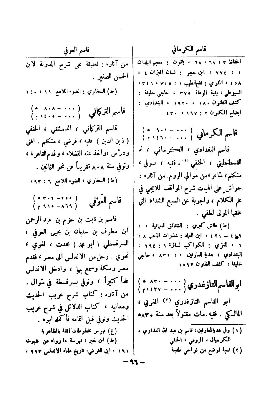 458، المقري: نفح الطيب 1: 345، 346، السيوطي: بغية الوعاة 375، حاجي خليفة: كشف الظنون 180، 1920، البغدادي: ايضاح المكنون 2: 197، 430 قاسم الكرماني (..- 901 هـ) (..- 1460 م) قاسم البغدادي، الكرماني، ثم القسطنطيني، الحنفي (1) .