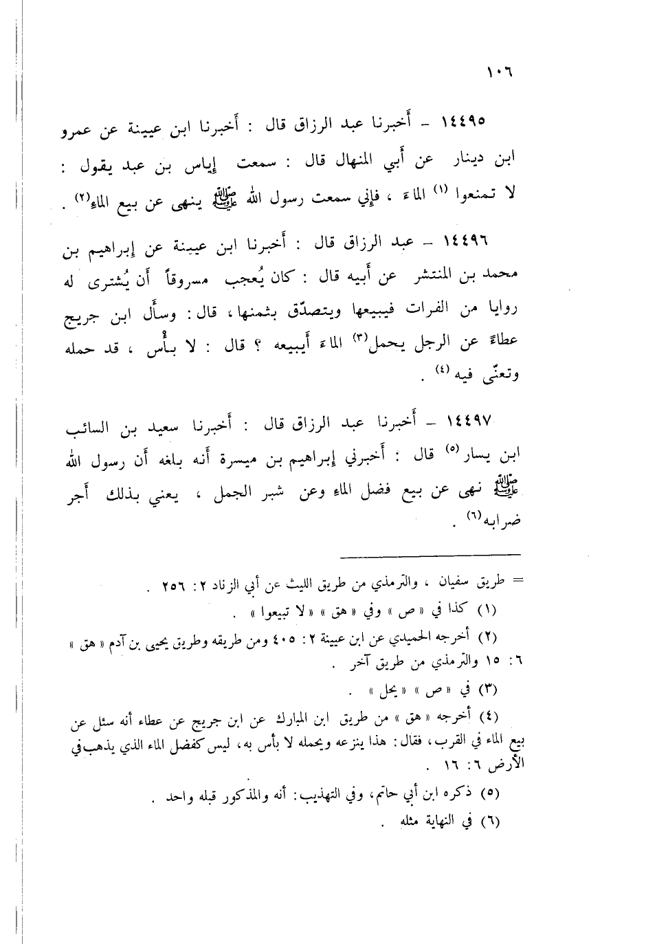 ١٤٤٩٧ - عَبْدُ الرَّزَّاقِ قَالَ: أَخْبَرَنَا سَعِيدُ بْنُ السَّائِبِ بْنِ يَسَارٍ قَالَ: أَخْبَرَنِي إِبْرَاهِيمُ بْنُ مَيْسَرَةَ، أَنَّهُ بَلَغَهُ «أَنَّ رَسُولَ اللَّهِ صَلَّى اللهُ عَلَيْهِ وَسَلَّمَ نَهَى عَنْ بَيْعِ فَضْلِ الْمَاءِ، وَعَنْ شَبْرِ الْجَمَلِ» يَعْنِي بَذْلك َ أَجْرِ ضِرَابِهِ