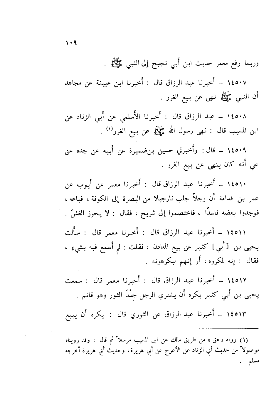 ١٤٥٠٨ - قَالَ: أَخْبَرَنَا الْأَسْلَمِيُّ، عَنْ أَبِي الزِّنَادِ، عَنِ ابْنِ الْمُسَيِّبِ قَالَ: «نَهَى رَسُولُ اللَّهِ صَلَّى اللهُ عَلَيْهِ وَسَلَّمَ عَنْ بَيْعِ الْغَرَرِ»