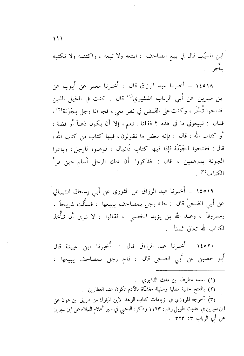 ١٤٥٢٠ - عَبْدُ الرَّزَّاقِ قَالَ: أَخْبَرَنَا ابْنُ عُيَيْنَةَ، قَالَ أَبُو حُصَيْنٍ: عَنْ أَبِي الضُّحَى قَالَ: قَدِمَ رَجُلٌ بِمَصَاحِفَ يَبِيعُهَا فَسَأَلْتُ ثَلَاثَةً لَا آلُو: مَسْرُوقًا، وَشُرَيْحًا، وَعَبْدَ اللَّهِ بْنَ يَزِيدَ الْخَطْمِيَّ، فَكُلُّهُمْ كَرِهَهُ، وَقَالُوا: «لَا نَرَى أَنْ تَأْخُذَ لِكِتَابِ اللَّهِ تَعَالَى ثَمَنًا»
