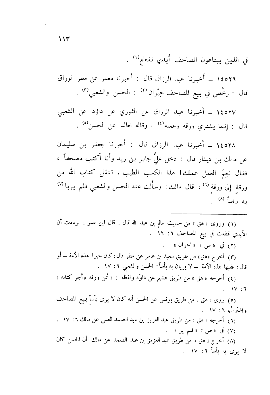 ١٤٥٢٨ - عَبْدُ الرَّزَّاقِ قَالَ: أَخْبَرَنَا جَعْفَرُ بْنُ سُلَيْمَانَ، عَنْ مَالِكِ بْنِ دِينَارٍ قَالَ: دَخَلَ عَلَيَّ جَابِرُ بْنُ زَيْدٍ وَأَنَا أَكْتَبُ، مُصْحَفًا فَقَالَ: «نِعْمَ الْعَمَلُ عَمَلُكَ، هَذَا الْكَسْبُ الطَّيِّبُ تَنْقِلُ كِتَابَ اللَّهِ مِنْ وَرَقَةٍ إِلَى وَرَقَةٍ»، قَالَ مَالِكٌ: وَسَأَلْتُ عَنْهُ الْحَسَنَ، وَالشَّعْبِيَّ «فَلَمْ يَرَيَا بِهِ بَأْسًا»