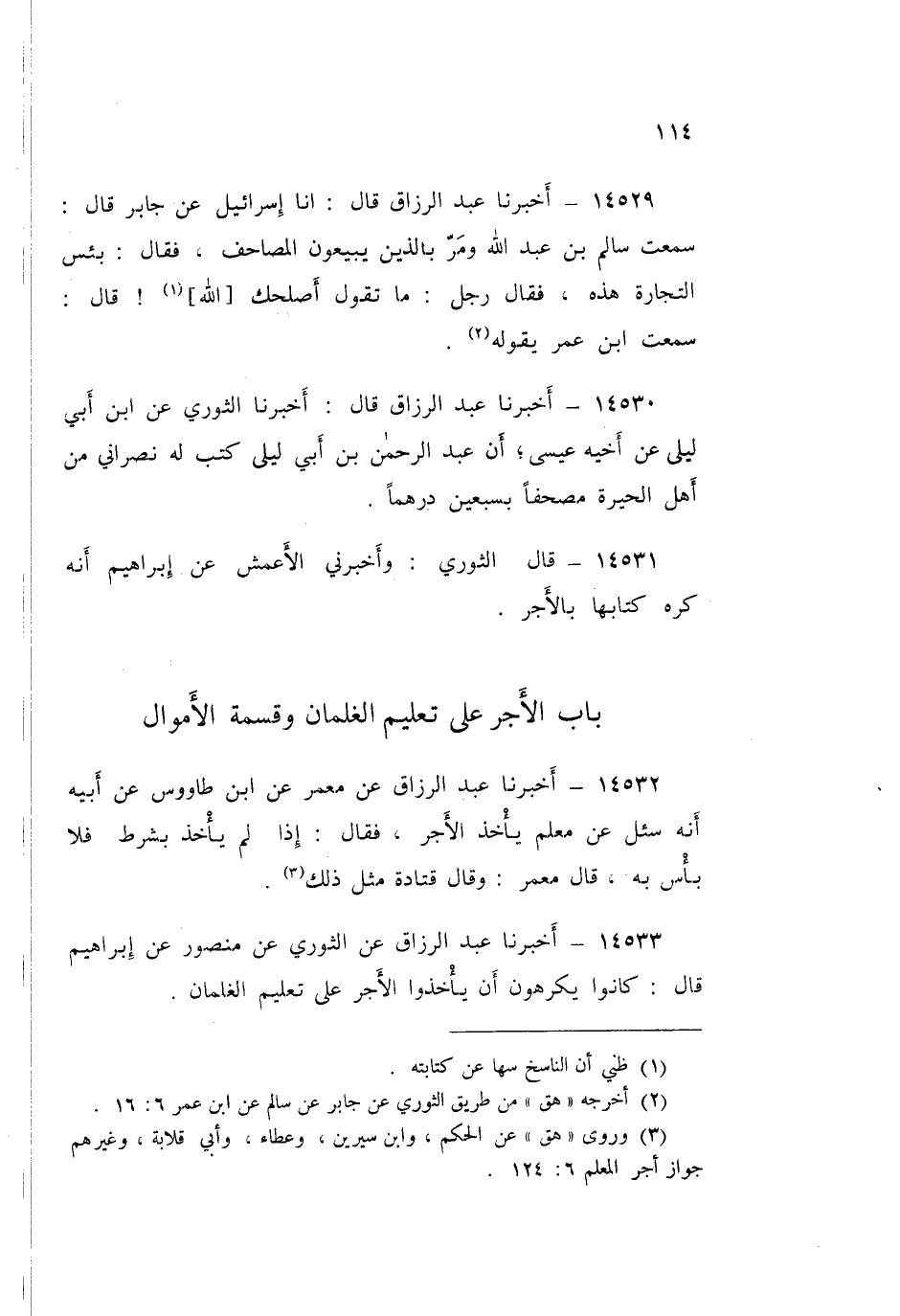 ١٤٥٣٠ - عَبْدُ الرَّزَّاقِ قَالَ: أَخْبَرَنَا الثَّوْرِيُّ، عَنِ ابْنِ أَبِي لَيْلَى، عَنْ أَخِيهِ عِيسَى، «أَنَّ عَبْدَ الرَّحْمَنِ بْنَ أَبِي لَيْلَى، كَتَبَ لَهُ نَصْرَانِي مِنْ أَهْلِ الْحِيرَةِ مُصْحَفًا بِسَبْعِينَ دِرْهَمًا»