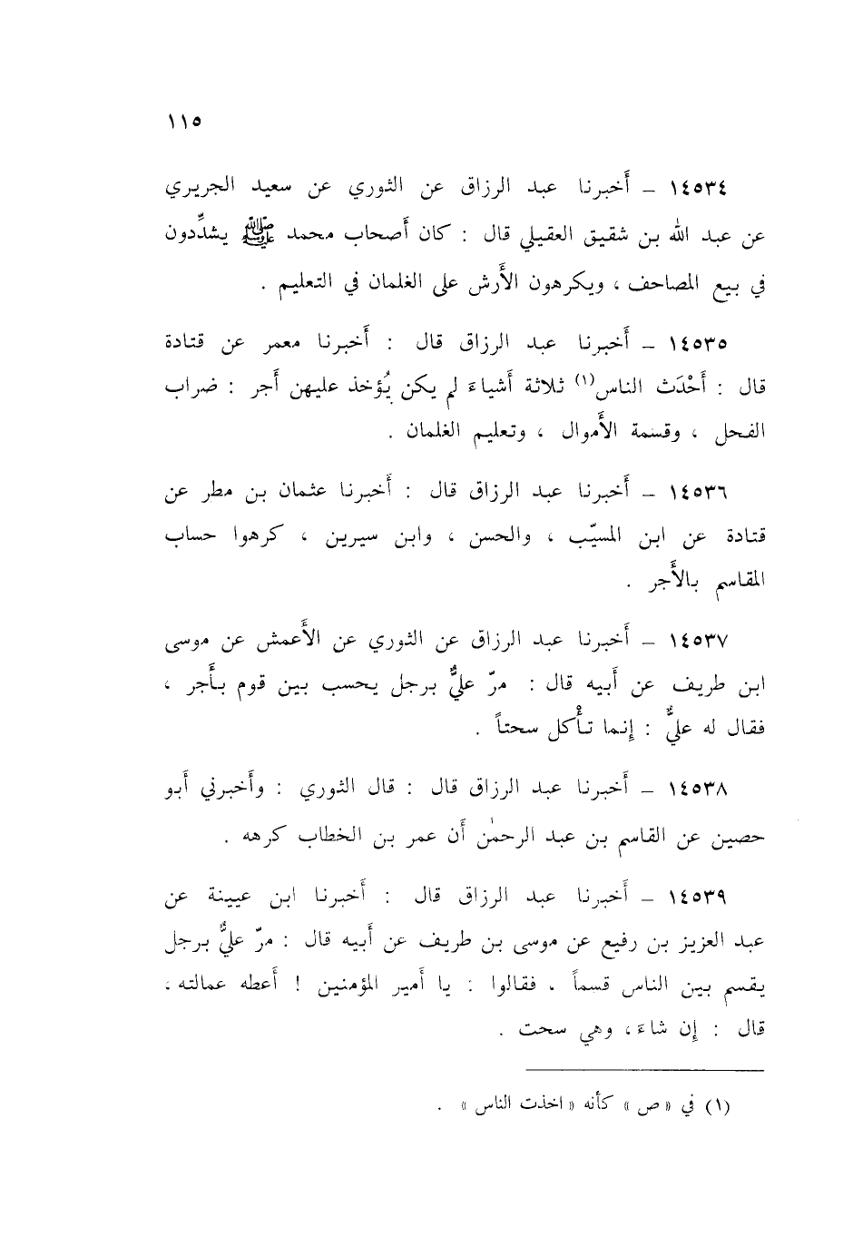 ١٤٥٣٤ - أَخْبَرَنَا عَبْدُ الرَّزَّاقِ قَالَ: عَنِ الثَّوْرِيِّ، عَنْ سَعِيدٍ الْجَرِيرِيِّ، عَنْ عَبْدِ اللَّهِ بْنِ شَقِيقٍ الْعُقَيْلِيِّ قَالَ: «كَانَ أَصْحَابُ مُحَمَّدٍ صَلَّى اللهُ عَلَيْهِ وَسَلَّمَ يُشَدِّدُونَ فِي بَيْعِ الْمَصَاحِفِ وَيَكْرَهُونَ الْأَرْشِ عَلَى الْغِلْمَانِ فِي التَّعْلِيمِ»