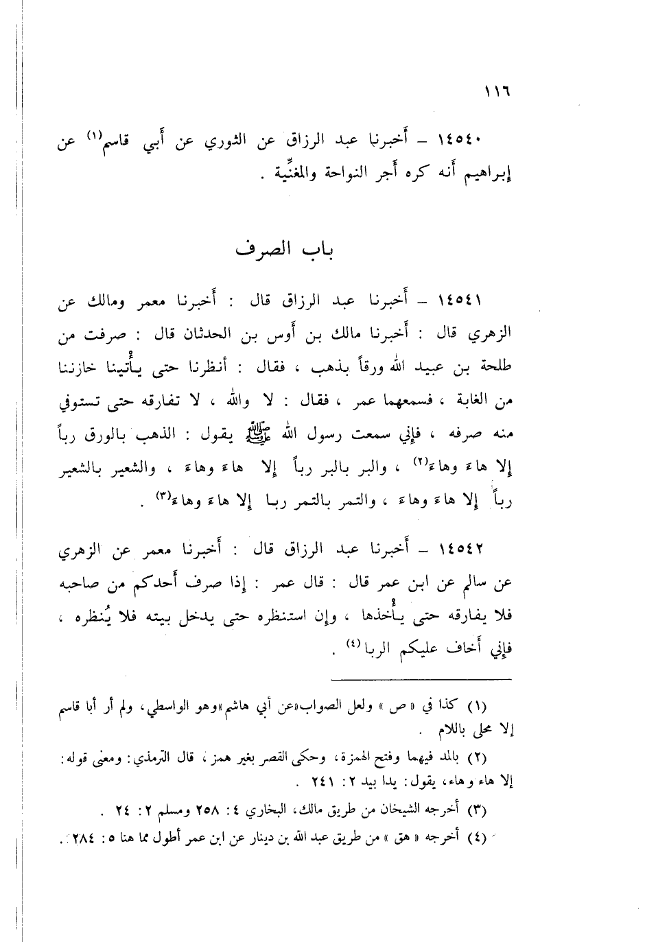 ١٤٥٤١ - عَبْدُ الرَّزَّاقِ قَالَ: أَخْبَرَنَا مَعْمَرٌ، وَمَالِكٌ، عَنِ الزُّهْرِيِّ قَالَ: أَخْبَرَنَا مَالِكُ بْنُ أَوسِ بْنِ الْحَدَثَانِ قَالَ: صَرَفْتُ مِنْ طَلْحَةَ بْنِ عُبَيْدِ اللَّهِ وَرَقًا بِذَهَبٍ، فَقَالَ: أَنْظِرْنَا حَتَّى يَأْتِيَنَا خَازِنُنَا مِنَ الْغَابَةِ، فَسَمِعَهُمَا عُمَرُ فَقَالَ: لَا وَاللَّهِ لَا تُفَارِقْهُ حَتَّى تَسْتَوْفِيَ مِنْهُ صَرْفَهُ، فَإِنِّي سَمِعْتُ رَسُولَ اللَّهِ صَلَّى اللهُ عَلَيْهِ وَسَلَّمَ يَقُولُ: «الذَّهَبُ بِالْوَرَقِ رِبًا إِلَّا هَاءَ وَهَاءَ، وَالْبُرُّ بِالْبُرِّ رِبًا إِلَّا هَاءَ وَهَاءَ، وَالشَّعِيرُ بِالشَّعِيرِ رِبًا إِلَّا هَاءَ وَهَاءَ، وَالتَّمْرُ بِالتَّمْرِ رِبًا إِلَّا هَاءَ وَهَاءَ»