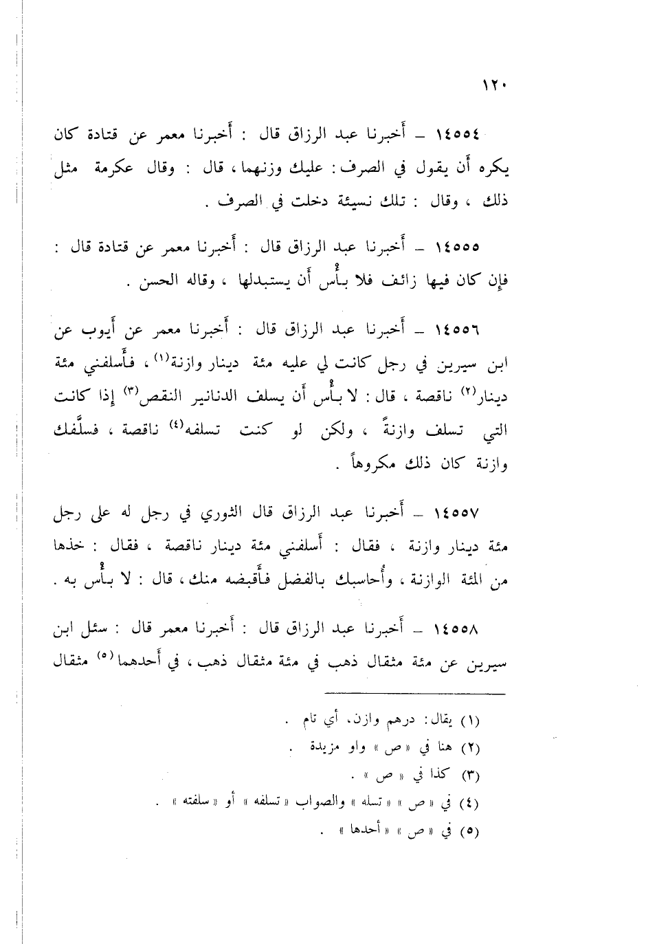 ١٤٥٥٦ - عَبْدُ الرَّزَّاقِ قَالَ: أَخْبَرَنَا مَعْمَرٌ، عَنْ أَيُّوبَ، عَنِ ابْنِ سِيرِينَ فِي رَجُلٍ كَانَتْ لِي عَلَيْهِ مِائَةُ دِينَارٍ وَازِنَةٍ فَأَسْلَفَنِي مِائَةَ دِينَارٍ نَاقِصَةٍ قَالَ: «لَا بَأْسَ أَنْ يُسَلِّفَ الدَّنَانِيرَ النُّقَّصَ، إِذَا كَانَتِ الَّتِي تُسَلَّفُ وَازِنَةً، وَلَكِنْ لَوْ كُنْتَ تُسَلِّفُهُ نَاقِصَةً، فَسَلَّفَكَ وَازِنَةً كَانَ ذَلِكَ مَكْرُوهًا»