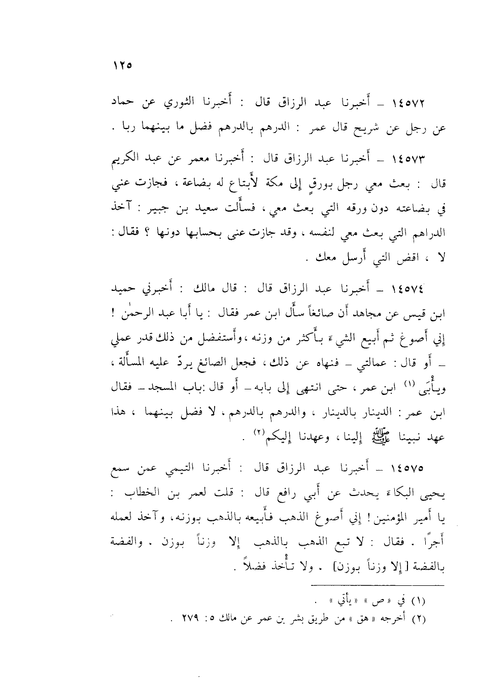 ١٤٥٧٤ - عَبْدُ الرَّزَّاقِ قَالَ: قَالَ مَالِكٌ: أَخْبَرَنِي حُمَيْدُ بْنُ قَيْسٍ، عَنْ مُجَاهِدٍ، أَنَّ صَائِغًا سَأَلَ ابْنَ عُمَرَ فَقَالَ: يَا أَبَا عَبْدِ الرَّحْمَنِ، إِنِّي أَصُوغُ، ثُمَّ أَبِيعُ الشَّيْءِ بِأَكْثَرَ مِنْ وَزْنِهِ، وَأَسْتَفْضِلُ مِنْ ذَلِكَ قَدْرَ عَمَلِي، أَوْ قَالَ عِمَالَتِي، فَنَهَاهُ عَنْ ذَلِكَ، فَجَعَلَ الصَّائِغُ يَرُدُّ عَلَيْهِ الْمَسْأَلَةَ، وَيَأْبَى ابْنُ عُمَرَ حَتَّى انْتَهَى إِلَى بَابِهِ، أَوْ قَالَ: بَابَ الْمِسْجِدِ، فَقَالَ ابْنُ عُمَرَ: «الدِّينَارُ بِالدِّينَارِ، وَالدِّرْهَمُ بِالدِّرْهَمِ، لَا فَضْلَ بَيْنَهُمَا، هَذَا عَهْدُ نَبِيِّنَا صَلَّى اللهُ عَلَيْهِ وَسَلَّمَ إِلَيْنَا وَعَهْدِنَا إِلَيْكُمْ»