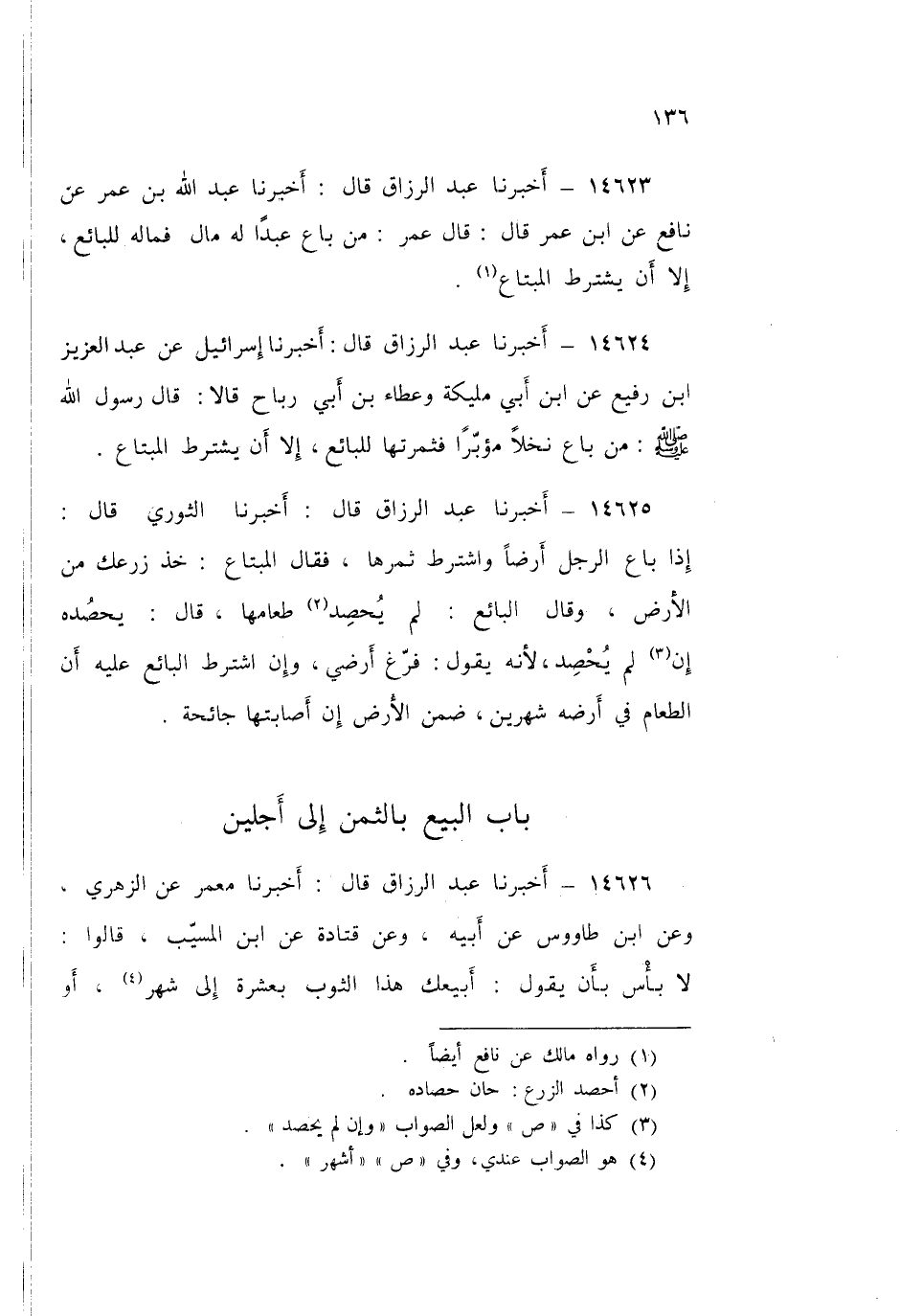 ١٤٦٢٤ - عَبْدُ الرَّزَّاقِ قَالَ: أَخْبَرَنَا إِسْرَائِيلُ، عَنْ عَبْدِ الْعَزِيزِ بْنِ رُفَيْعٍ، عَنِ ابْنِ أَبِي مُلَيْكَةَ، وَعَطَاءِ بْنِ أَبِي رَبَاحٍ، قَالَا: قَالَ رَسُولُ اللَّهِ صَلَّى اللهُ عَلَيْهِ وَسَلَّمَ: «مَنْ بَاعَ نَخْلًا مُؤَبَّرًا فَثَمَرَتُهَا لِلْبَائِعِ إِلَّا أَنْ يَشْتَرِطَ الْمُبْتَاعُ»