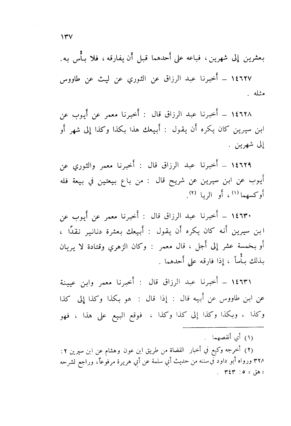 ١٤٦٢٨ - عَبْدُ الرَّزَّاقِ قَالَ: أَخْبَرَنَا مَعْمَرٌ، عَنْ أَيُّوبَ، عَنِ ابْنِ سِيرِينَ كَانَ يَكْرَهُ أَنْ يَقُولَ: أَبِيعُكَ هَذَا بِكَذَا، وَكَذَا إِلَى شَهْرٍ أَوْ إِلَى شَهْرَيْنِ "