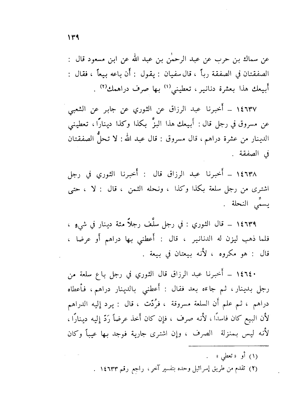 ١٤٦٣٧ - أَخْبَرَنَا عَبْدُ الرَّزَّاقِ قَالَ: عَنِ الثَّوْرِيِّ، عَنْ جَابِرٍ، عَنِ الشَّعْبِيِّ، عَنْ مَسْرُوقٍ، فِي رَجُلٍ قَالَ: أَبِيعُكَ هَذَا الْبَزُّ بِكَذَا، وَكَذَا دِينَارًا، تُعْطِينِي الدِّينَارَ مِنْ عَشَرَةَ دَرَاهِمَ، قَالَ مَسْرُوقٌ: قَالَ عَبْدُ اللَّهِ: «لَا تَحِلُّ الصَّفْقَتَانِ فِي الصَّفْقَةِ»