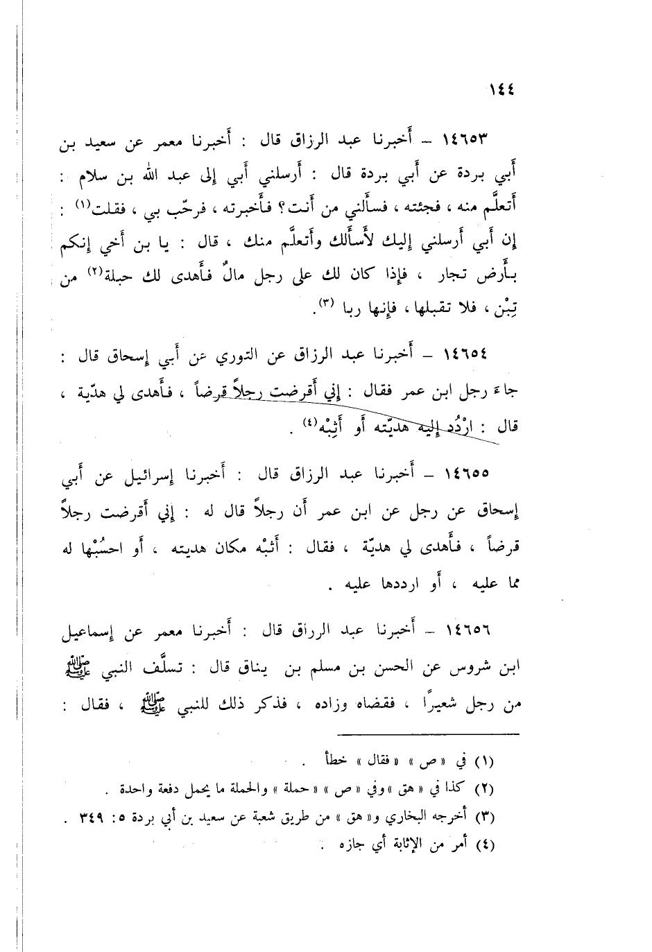 ١٤٦٥٦ - عَبْدُ الرَّزَّاقِ قَالَ: أَخْبَرَنَا مَعْمَرٌ، عَنْ إِسْمَاعِيلَ بْنِ شروس، عَنِ الْحَسَنِ بْنِ مُسْلِمِ بْنِ يَنَّاقٍ قَالَ: تَسَلَّفَ النَّبِيُّ صَلَّى اللهُ عَلَيْهِ وَسَلَّمَ مِنْ رَجُلٍ شَعِيرًا، فَقَضَاهُ وَزَادَهُ، فَذُكِرَ ذَلِكَ لِلنَّبِيِّ صَلَّى اللهُ عَلَيْهِ وَسَلَّمَ فَقَالَ: «هُوَ نَيْلٌ لَكَ»