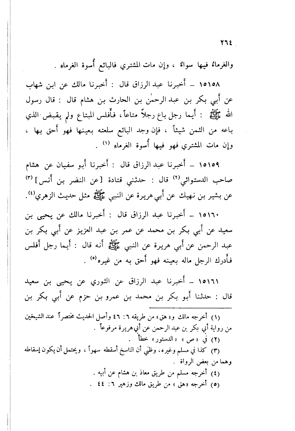 ١٥١٦٠ - عَبْدُ الرَّزَّاقِ قَالَ: أَخْبَرَنَا مَالِكٌ، عَنْ يَحْيَى بْنِ سَعِيدٍ، عَنْ أَبِي بَكْرِ بْنِ مُحَمَّدٍ، عَنْ عُمَرَ بْنِ عَبْدِ الْعَزِيزِ، عَنْ أَبِي بَكْرِ بْنِ عَبْدِ الرَّحْمَنِ، عَنْ أَبِي هُرَيْرَةَ، عَنِ النَّبِيِّ صَلَّى اللهُ عَلَيْهِ وَسَلَّمَ أَنَّهُ قَالَ: «أَيُّمَا رَجُلٍ أَفْلَسَ فَأَدْرَكَ الرَّجُلُ مَالَهُ بِعَيْنِهِ، فَهُوَ أَحَقُّ بِهِ مِنْ غَيْرِهِ»