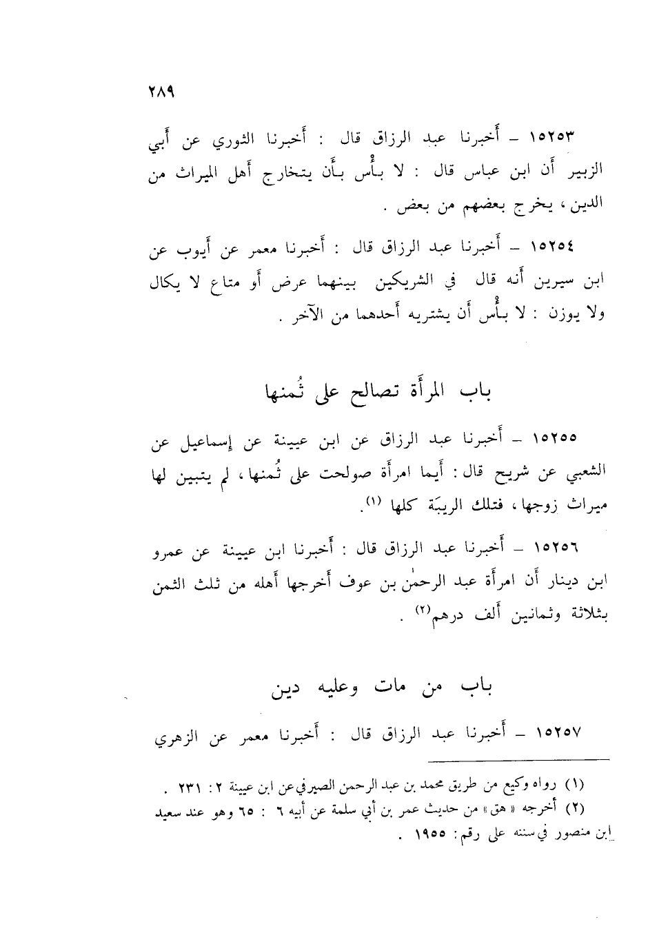 ١٥٢٥٦ - عَبْدُ الرَّزَّاقِ قَالَ: أَخْبَرَنَا ابْنُ عُيَيْنَةَ، عَنْ عَمْرِو بْنِ دِينَارٍ أَنَّ امْرَأَةَ عَبْدِ الرَّحْمَنِ بْنِ عَوْفٍ أَخْرَجَهَا أَهْلُهُ مِنْ ثُلُثِ الثُّمُنِ بِثَلَاثَةٍ وَثَمَانِينَ أَلْفَ دِرْهَمٍ "