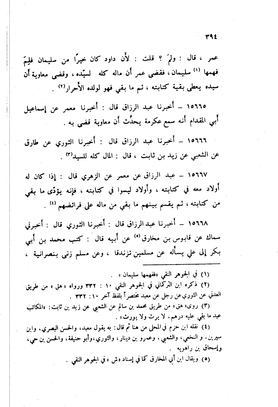 ١٥٦٦٦ - عَبْدُ الرَّزَّاقِ قَالَ: أَخْبَرَنَا الثَّوْرِيُّ، عَنْ طَارِقٍ، عَنِ الشَّعْبِيِّ، عَنْ زَيْدِ بْنِ ثَابِتٍ قَالَ: «الْمَالُ كُلُّهُ لِلسَّيِّدِ»