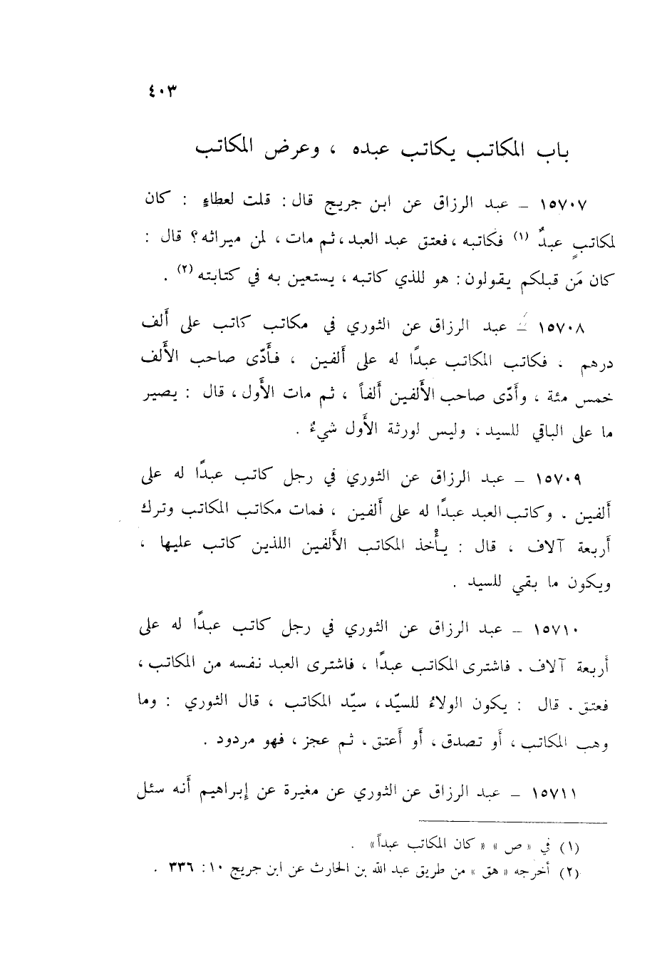 ١٥٧١٠ - عَنِ الثَّوْرِيِّ فِي رَجُلٍ كَاتَبَ عَبْدًا لَهُ عَلَى أَرْبَعَةِ آلَافٍ، فَاشْتَرَى الْمُكَاتَبُ عَبْدًا، فَاشْتَرَى الْعَبْدُ نَفْسَهُ مِنَ الْمُكَاتَبِ، فَعَتَقَ قَالَ: «يَكُونُ الْوَلَاءُ لِلسَّيِّدِ سَيِّدِ الْمُكَاتَبِ» قَالَ الثَّوْرِيُّ: «وَمَا وَهْبَ الْمُكَاتَبُ، أَوْ تَصَدَّقَ، أَوْ أَعْتَقَ، ثُمَّ عَجَزَ فَهُوَ مَرْدُودٌ»