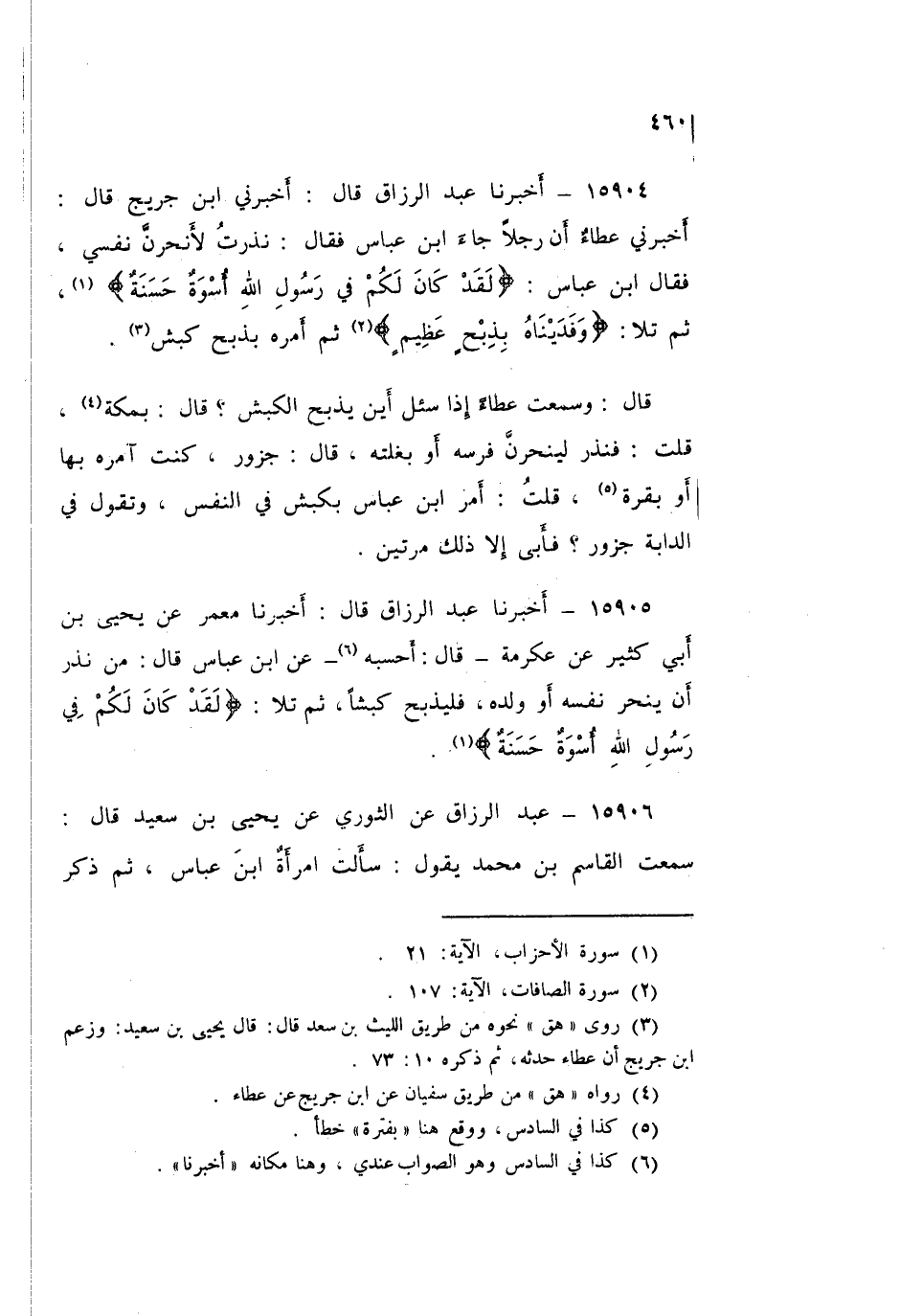 ١٥٩٠٤ - عَبْدُ الرَّزَّاقِ، أَخْبَرَنِي ابْنُ جُرَيْجٍ قَالَ: أَخْبَرَنِي عَطَاءٌ، أَنَّ رَجُلًا جَاءَ ابْنَ عَبَّاسٍ فَقَالَ: نَذَرْتُ لَأَنْحَرَنَّ نَفْسِي، فَقَالَ ابْنُ عَبَّاسٍ: " {لَقَدْ كَانَ لَكُمْ فِي رَسُولِ اللَّهِ أُسْوَةٌ} [الأحزاب: ٢١] حَسَنَةٌ "، ثُمَّ تَلَا: {وَفَدَيْنَاهُ بِذِبْحٍ عَظِيمٍ} [الصافات: ١٠٧]، ثُمَّ أَمَرَهُ بِذَبْحِ كَبْشٍ " قَالَ: وَسَمِعْتُ عَطَاءً إِذَا سُئِلَ: أَيْنَ يَذْبَحُ الْكَبْشَ؟ قَالَ: بِمَكَّةَ، قُلْتُ: فَنَذَرَ لَيَنْحَرَنَّ فَرَسَهُ أَوْ بَغْلَتَهُ قَالَ: جَزُورٌ كُنْتُ آمُرُهُ بِهَا أَوْ بَقَرَةٌ، قُلْتُ: «أَمَرَ ابْنُ عَبَّاسٍ بِكَبْشٍ فِي النَّفْسِ»، وَتَقُولُ فِي الدَّابَّةِ: جَزُورٌ؟ فَأَبَى إِلَّا ذَلِكَ مَرَّتَيْنِ