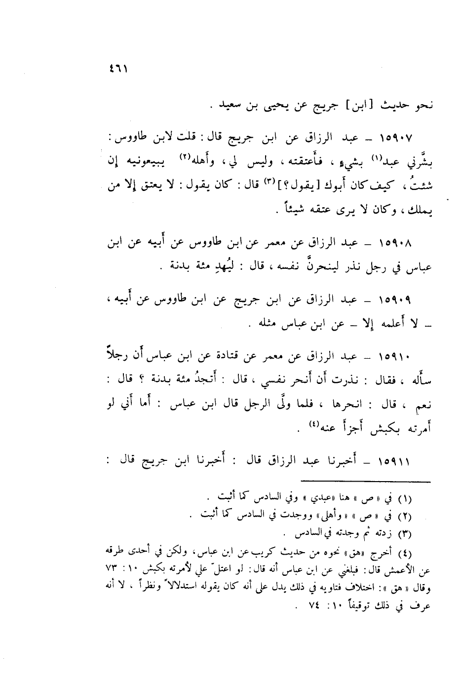 ١٥٩٠٨ - عَنْ مَعْمَرٍ، عَنِ ابْنِ طَاوُسٍ، عَنْ أَبِيهِ، عَنِ ابْنِ عَبَّاسٍ فِي رَجُلٍ نَذَرَ لَيَنْحَرَنَّ نَفْسَهُ قَالَ: «لِيُهْدِ مِائَةَ بَدَنَةٍ»، عَبْدُ الرَّزَّاقِ،