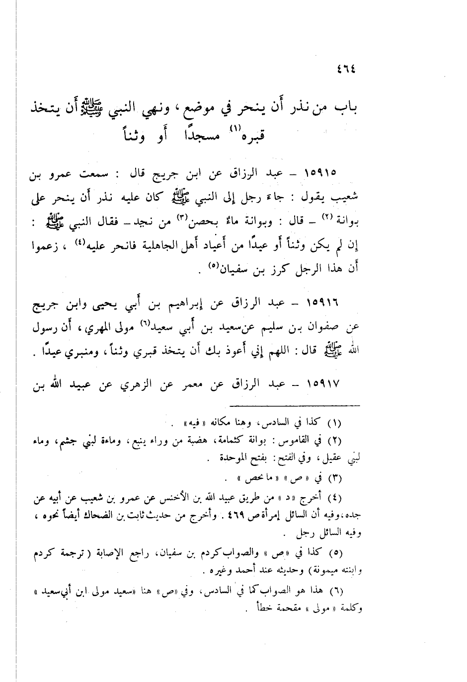 ١٥٩١٥ - عَنِ ابْنِ جُرَيْجٍ قَالَ: سَمِعْتُ عَمْرَو بْنَ شُعَيْبٍ يَقُولُ: جَاءَ رَجُلٌ إِلَى النَّبِيِّ صَلَّى اللهُ عَلَيْهِ وَسَلَّمَ كَانَ عَلَيْهِ نَذْرٌ أَنْ يَنْحَرَ عَلَى بُوَانَةٍ - قَالَ: وَبُوانَةٌ: مَاءٌ بِحْصِنٍ مِنْ نَجْدٍ - فَقَالَ النَّبِيُّ صَلَّى اللهُ عَلَيْهِ وَسَلَّمَ: «إِنْ لَمْ يَكُنْ وَثنا أَوْ عِيدًا مِنْ أَعْيَادِ أَهْلِ الْجَاهِلِيَّةِ فَانْحَرْ عَلَيْهِ» زَعَمُوا أَنَّ هَذَا الرَّجُلَ كُرْزُ بْنُ سُفْيَانَ