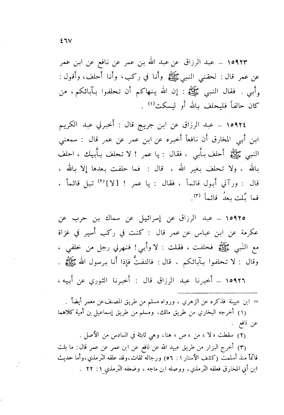 ١٥٩٢٦ - عَبْدُ الرَّزَّاقِ قَالَ: أَخْبَرَنَا الثَّوْرِيُّ، عَنْ أَبِيهِ، وَالْأَعْمَشِ، وَمَنْصُورٍ، عَنْ سَعْدِ بْنِ عُبَيْدَةَ، عَنِ ابْنِ عُمَرَ قَالَ: كَانَ عُمَرُ يَحْلِفُ: وَأَبِي، فَنَهَاهُ رَسُولُ اللَّهِ صَلَّى اللهُ عَلَيْهِ وَسَلَّمَ وَقَالَ: " مَنْ حَلَفَ بِشَيْءٍ مِنْ دُونِ اللَّهِ فَقَدْ أَشْرَكَ - أَوْ قَالَ: أَلَا هُوَ مُشْرِكٌ - "