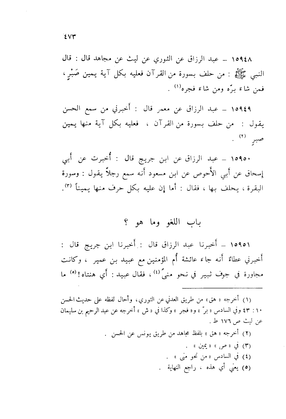 ١٥٩٥١ - عَبْدُ الرَّزَّاقِ قَالَ: أَخْبَرَنَا ابْنُ جُرَيْجٍ قَالَ: أَخْبَرَنِي عَطَاءٌ، أَنَّهُ جَاءَ عَائِشَةَ أُمَّ الْمُؤْمِنِينَ مَعَ عُبَيْدِ بْنِ عُمَيْرٍ، وَكَانَتْ مُجَاوِرَةً فِي جَوْفِ ثَبِيرٍ فِي نَحْوِ مِنًى، فَقَالَ عُبَيْدٌ: أَيْ هَنْتَاهُ مَا ⦗٤٧٤⦘ قَوْلُ اللَّهِ عَزَّ وَجَلَّ: {لَا يُؤَاخِذُكُمُ اللَّهُ بِاللَّغْوِ فِي أَيْمَانِكُمْ} [البقرة: ٢٢٥] قَالَتْ: " هُوَ الرَّجُلُ يَقُولُ: لَا وَاللَّهِ، وَبَلَى وَاللَّهِ "