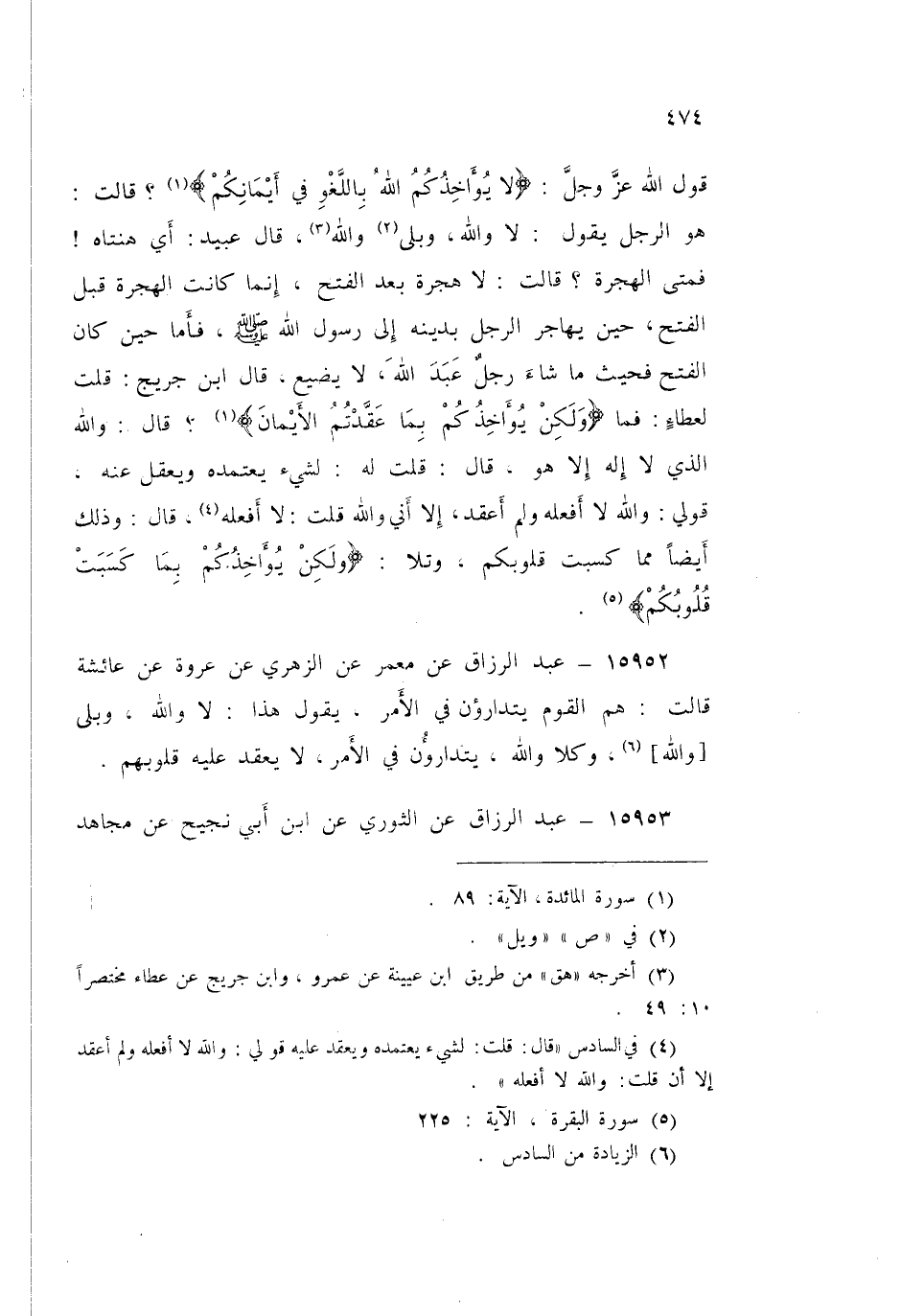 قَالَ عُبَيْدٌ: أَيْ هَنْتَاهُ فَمَتَى الْهِجْرَةُ؟ قَالَتْ: «لَا هِجْرَةَ بَعْدَ الْفَتْحِ، إِنَّمَا كَانَتِ الْهِجْرَةُ قَبْلَ الْفَتْحِ، حِينَ يُهَاجِرُ الرَّجُلُ بِدِينِهِ إِلَى رَسُولِ اللَّهِ صَلَّى اللهُ عَلَيْهِ وَسَلَّمَ، فَأَمَّا حِينَ كَانَ الْفَتْحُ، فَحَيْثُمَا شَاءَ رَجُلٌ عَبَدَ اللَّهَ، لَا يَضِيعُ» قَالَ ابْنُ جُرَيْجٍ: قُلْتُ لِعَطَاءٍ: فَمَا {وَلَكِنْ يُؤَاخِذُكُمْ بِمَا عَقَّدْتُمُ الْأَيْمَانَ} [المائدة: ٨٩] قَالَ: «وَاللَّهِ الَّذِي لَا إِلَهُ إِلَّا هُوَ» قَالَ: قُلْتُ لَهُ: لِشَيْءٍ يَعْتَمِدُهُ وَيَعْقِلُ عَنْهُ، قَوْلِي: وَاللَّهِ لَا أَفْعَلُهُ وَلَمْ أَعْقِدْ، إِلَّا أَنِّي وَاللَّهِ قُلْتُ: لَا أَفْعَلُهُ قَالَ: «وَذَلِكَ أَيْضًا مِمَّا كَسَبَتْ قُلُوبُكُمْ»، وَتَلَا: {وَلَكِنْ يُؤَاخِذُكُمْ بِمَا كَسَبَتْ قُلُوبُكُمْ} [البقرة: ٢٢٥]