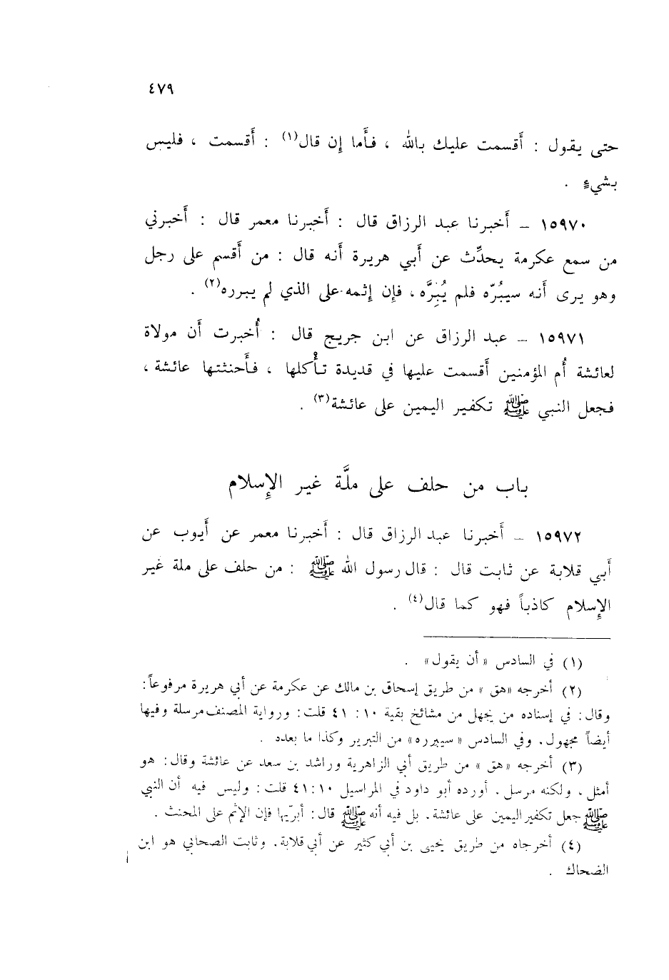 ١٥٩٧٢ - عَبْدُ الرَّزَّاقِ قَالَ: أَخْبَرَنَا مَعْمَرٌ، عَنْ أَيُّوبَ، عَنْ أَبِي قِلَابَةَ، عَنْ ثَابِتٍ قَالَ: قَالَ رَسُولُ اللَّهِ صَلَّى اللهُ عَلَيْهِ وَسَلَّمَ: «مَنْ حَلَفَ عَلَى مِلَّةٍ غَيْرِ الْإِسْلَامِ كَاذِبًا» فَهُوَ كَمَا قَالَ