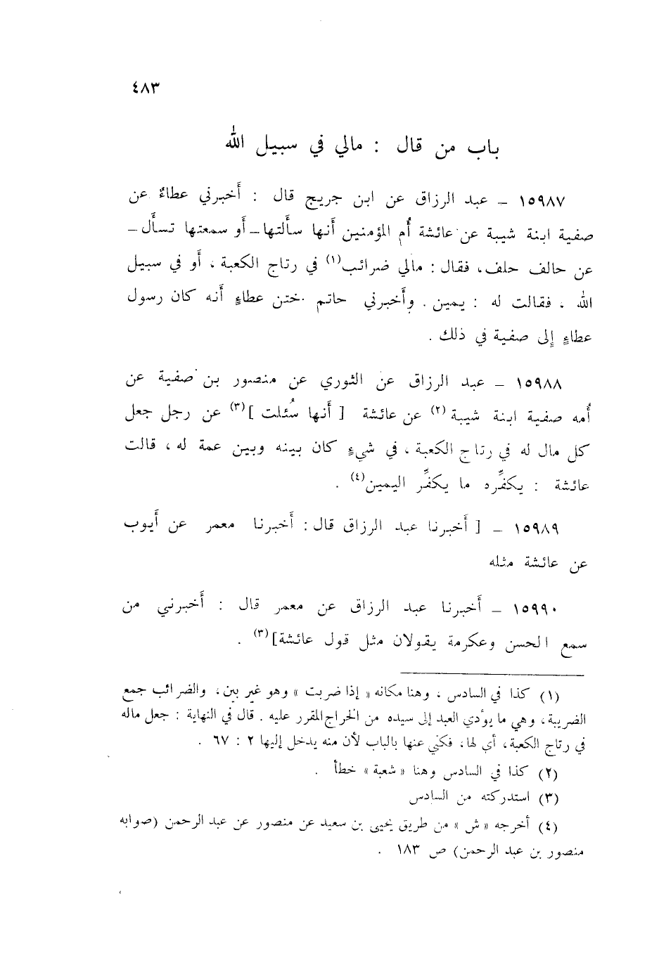 ١٥٩٨٧ - عَنِ ابْنِ جُرَيْجٍ قَالَ: أَخْبَرَنِي عَطَاءٌ، عَنْ صَفِيَّةَ ابْنَةِ شَيْبَةَ، عَنْ عَائِشَةَ أُمِّ الْمُؤْمِنِينَ، أَنَّهَا سَأَلَتْهَا، أَوْ سَمِعَتْهَا تَسْأَلُ، عَنْ حَالَفٍ حَلَفَ فَقَالَ: مَالِي ضَرَائِبٌ فِي رِتَاجِ الْكَعْبَةِ أَوْ فِي سَبِيلِ اللَّهِ، فَقَالَتْ: «لَهُ يَمِينٌ»، وَأَخْبَرَنِي حَاتِمٌ خَتَنُ عَطَاءٍ: «أَنَّهُ كَانَ رَسُولَ عَطَاءٍ إِلَى صَفِيَّةَ فِي ذَلِكَ»