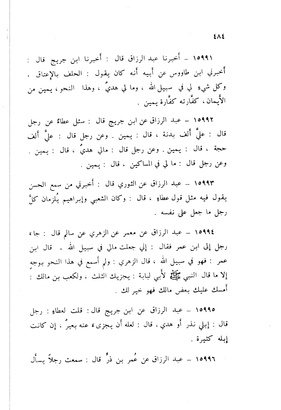 ١٥٩٩٢ - عَنِ ابْنِ جُرَيْجٍ قَالَ: سُئِلَ عَطَاءٌ عَنْ رَجُلٍ قَالَ: عَلَيَّ أَلْفُ بَدَنَةٍ قَالَ: «يَمِينٌ»، وَعَنْ رَجُلٍ قَالَ: عَلَيَّ أَلْفُ حَجَّةٍ قَالَ: «يَمِينٌ»، وَعَنْ رَجُلٍ قَالَ: مَالِي هَدْيٌ قَالَ: «يَمِينٌ»، وَعَنْ رَجُلٍ قَالَ: مَالِي فِي الْمَسَاكِينِ قَالَ: «يَمِينٌ»، عَبْدُ الرَّزَّاقِ،