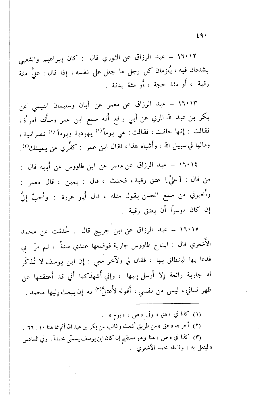 ١٦٠١٥ - عَنِ ابْنِ جُرَيْجٍ قَالَ: حُدِّثْتُ عَنْ مُحَمَّدٍ الْأَشْعَرِيِّ قَالَ: ابْتَاعَ طَاوُسٌ جَارِيَةً فَوَضَعَهَا عِنْدِي سَنَةً، ثُمَّ مَرَّ بِي فَدَعَا بِهَا لِيَنْطَلِقَ بِهَا، فَقَالَ لِي وَلِآخَرَ مَعِي: «إِنَّ ابْنَ يُوسُفَ لَا تُذْكَرُ لَهُ جَارِيَةٌ رَائِعَةٌ إِلَّا أَرْسَلَ إِلَيْهَا، وَإِنِّي أُشْهِدُكُمَا أَنِّي قَدْ أَعْتَقْتُهَا عَنْ ظَهْرِ لِسَانِي، لَيْسَ مِنْ نَفْسِي أَقُولُهُ لِأَعْتَلَّ بِهِ إِنْ يَبْعَثَ إِلَيْهَا مُحَمَّدٌ» وَسَمِعْتُ زَمْعَةَ يَقُولُ: أَخْبَرَنِي مُحَمَّدٌ الْأَشْعَرِيُّ، ثُمَّ ذَكَرَ هَذَا الْحَدِيثَ