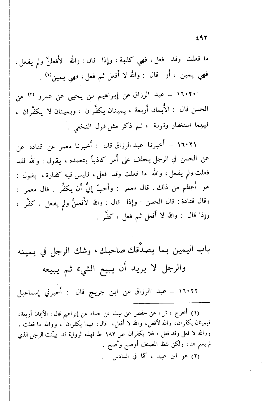 ١٦٠٢١ - عَبْدُ الرَّزَّاقِ قَالَ: أَخْبَرَنَا مَعْمَرٌ، عَنْ قَتَادَةَ، عَنِ الْحَسَنِ فِي الرَّجُلِ يَحْلِفُ عَلَى أَمَرٍ كَاذِبًا يَتَعَمَّدُهُ يَقُولُ: وَاللَّهِ لَقَدْ فَعَلْتُ وَلَمْ يَفْعَلْ، وَاللَّهِ مَا فَعَلْتُ وَقَدْ فَعَلَ، فَلَيْسَ فِيهِ كَفَّارَةٌ يَقُولُ: «هُوَ أَعْظَمُ مِنْ ذَلِكَ»، قَالَ مَعْمَرٌ: «وَأَحَبُّ إِلَيَّ أَنْ يُكَفِّرَ»