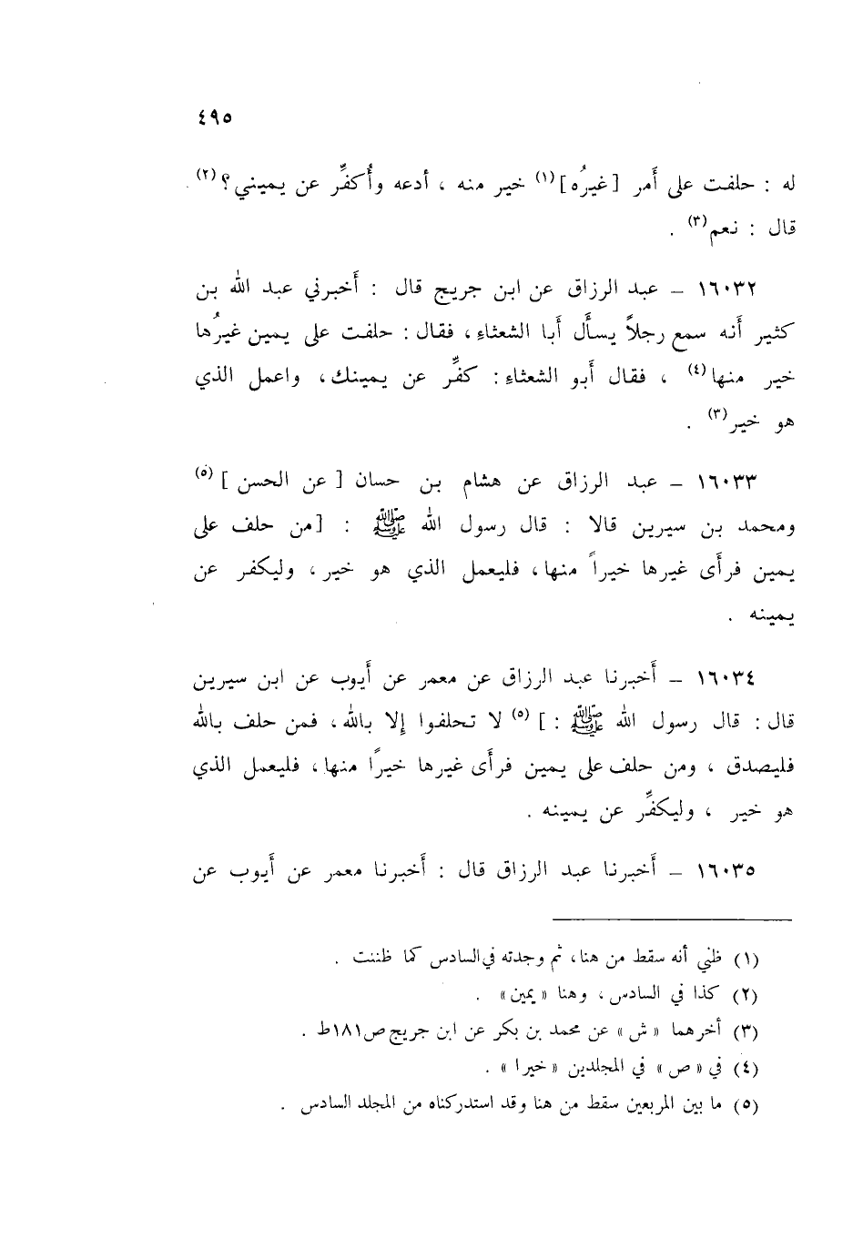 ١٦٠٣٤ - أَخْبَرَنَا عَبْدُ الرَّزَّاقِ، عَنْ مَعْمَرٍ، عَنْ أَيُّوبَ، عَنِ ابْنِ سِيرِينَ قَالَ: قَالَ رَسُولُ اللَّهِ صَلَّى اللهُ عَلَيْهِ وَسَلَّمَ: «لَا تَحْلِفُوا إِلَّا بِاللَّهِ، فَمَنْ حَلَفَ بِاللَّهِ فَلْيَصْدُقْ وَمَنْ حَلَفَ عَلَى يَمِينٍ فَرَأَى غَيْرَهَا خَيْرًا مِنْهَا فَلْيَعْمَلِ الَّذِي هُوَ خَيْرٌ وَلْيُكَفِّرْ، عَنْ يَمِينِهِ»